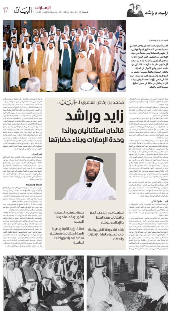 اعتبر الشيخ محمد حمد بن ركاض العامري عضو المجلس الاستشاري لإمارة أبوظبي، أن مفهوم السعادة ليس جديداً على دولة الإمارات، وأن المغفور لهما الشيخ زايد بن سلطان آل نهيان، والشيخ راشد بن سعيد آل مكتوم، طيب الله ثراهما، كانا أول من طبقاه لتغيير واقع الأحوال في الدولة، ولتكون السعادة واقعاً ملموساً، يشعر به المواطنون والمقيمون على حد سواء، حيث كانا في سعي دؤوب لخدمة الوطن، وبذلا كل ما يملكان من طاقة في سبيل تحقيق مسيرة الخير والنماء.