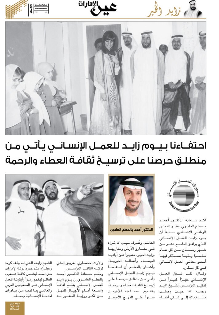 وختم سعادة الدكتور أحمد بالحطم العامري إن يوم زايد للعمل الإنساني يفتح آفاقاً واسعة أمام الأجيال لتنهل من فكر ورؤية المغفور له الشيخ زايد، الذي لم يقف كرمه وعطاؤه عند حدود دولة الإمارات، بل امتد ليشمل كافة شعوب العالم ليغدو رمزاً وأيقونة للعمل الإنساني على الصعيدين العربي والعالمي بما قدمه من مبادرات لخدمة الإنسانية جمعاء.