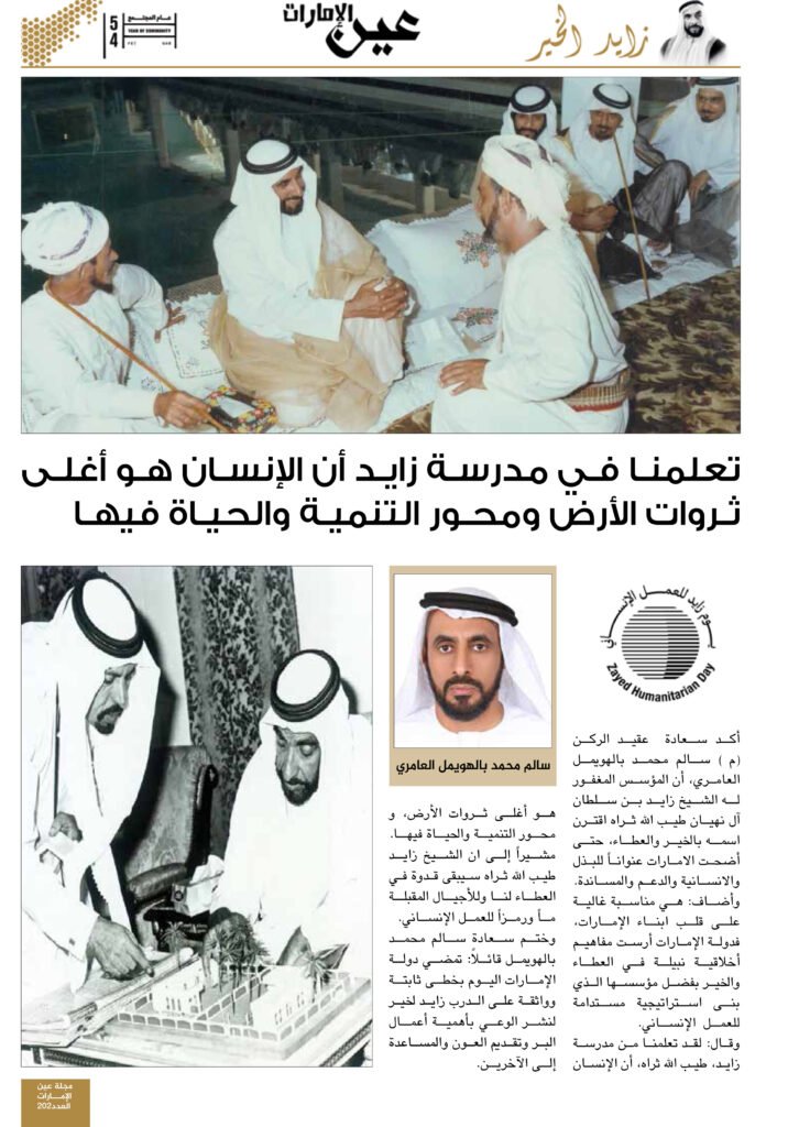 أكد سعادة عقيد الركن (م ) سالم محمد بالهويمل العامري، أن المؤسس المغفور له الشيخ زايد بن سلطان آل نهيان طيب الله ثراه اقترن اسمه بالخير والعطاء، حتى أضحت الامارات عنواناً للبذل والانسانية والدعم والمساندة.