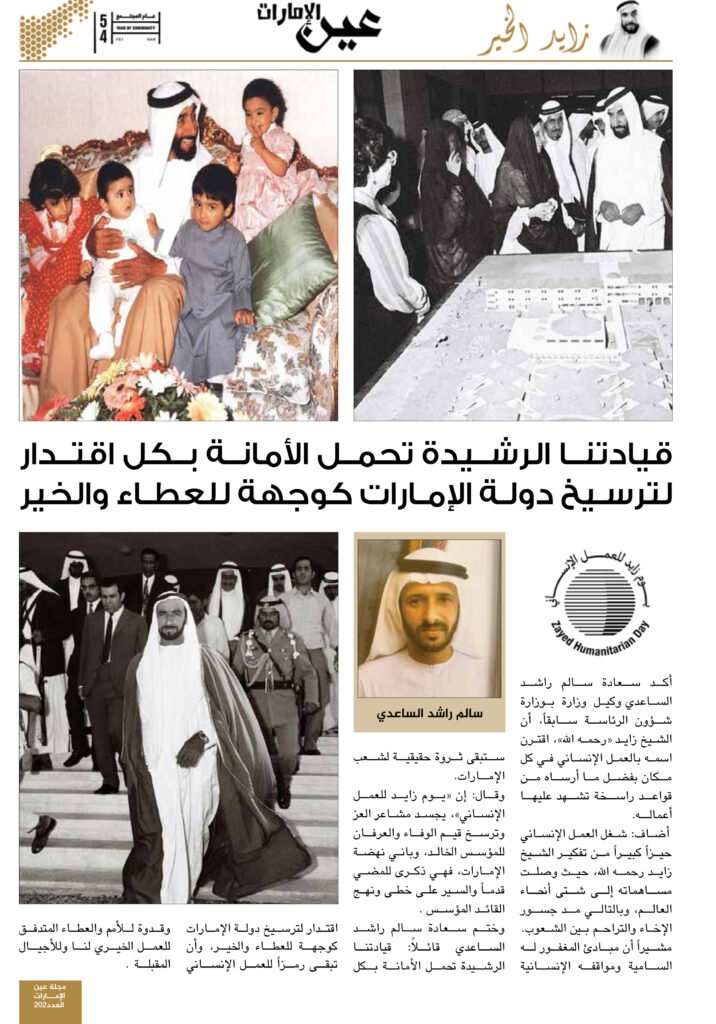 وقال: إن “يوم زايد للعمل الإنساني”، يجسد مشاعر العز وترسخ قيم الوفاء والعرفان للمؤسس الخالد، وباني نهضة الإمارات، فهي ذكرى للمضي قدماً والسير على خطى ونهج القائد المؤسس .