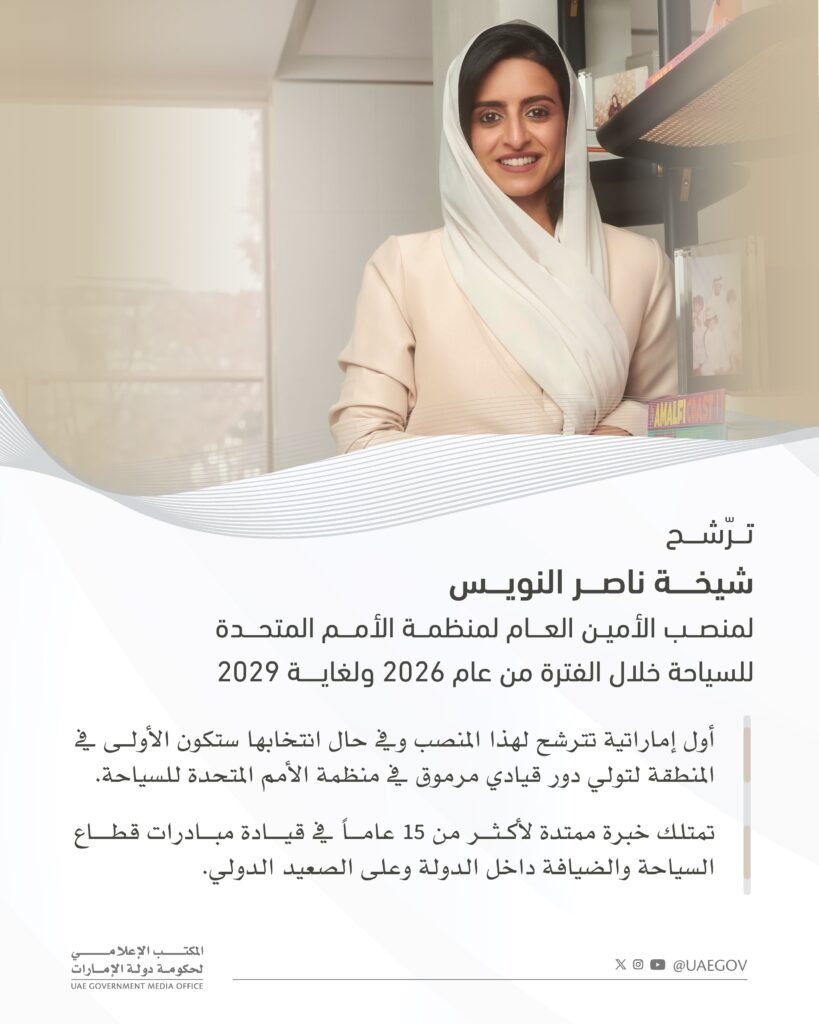 وأضاف معاليه: “يأتي ترشيح ابنة الإمارات شيخة النويس لمنصب الأمين العام لمنظمة الأمم المتحدة للسياحة، تأكيداً على السمعة الإيجابية التي تتمتع بها دولة الإمارات في المجال السياحي، ودورها المهم والفعّال في تعزيز نمو واستدامة قطاع السياحة العالمي، وكذلك تجربتها الاستثنائية التي قدمتها في هذا الصدد على مدار السنوات الماضية”.