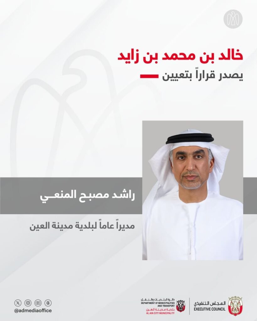 أصدر سموّ الشيخ خالد بن محمد بن زايد آل نهيان، ولي عهد أبوظبي رئيس المجلس التنفيذي لإمارة أبوظبي، قراراً بتعيين سعادة راشد مصبح المنعي، مديراً عاماً لبلدية مدينة العين.