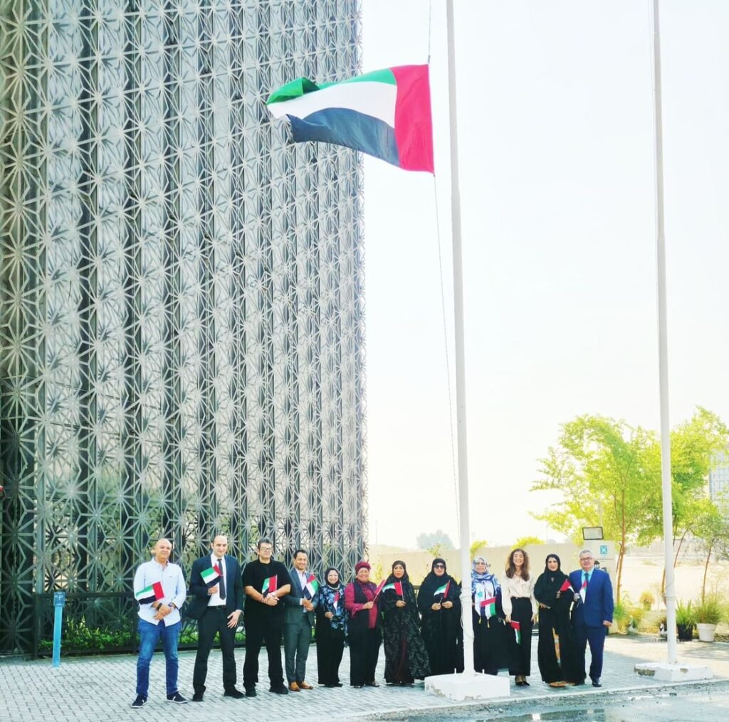 وأضافت أنه في الثالث من نوفمبر من كل عام، تتوحّد القلوب وترتفع الأيادي لتجديد العهد والوفاء لراية الوطن، رمز العزة والسيادة، التي تظل خفّاقةً بالعز والمجد تحت قيادة صاحب السمو الشيخ محمد بن زايد آل نهيان، رئيس الدولة، حفظه الله، وإخوانه أصحاب السمو أعضاء المجلس الأعلى، حكام الإمارات”.